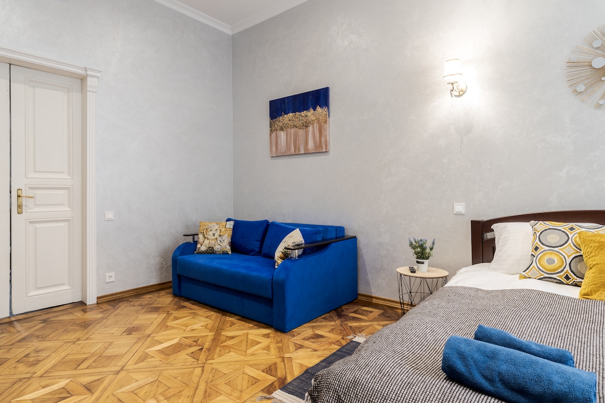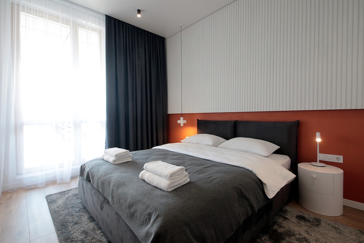デザイナーが改装した新しいアパートを借りる、中心部にある1ベッドルームのアパートで、平方メートルのマーケットから徒歩5分です。 アパートは明るい色で、2名様にぴったりですが、4名様(お子様2名様+2名様)で快適にご宿泊いただけます。大きなダブルベッド、ソファ。