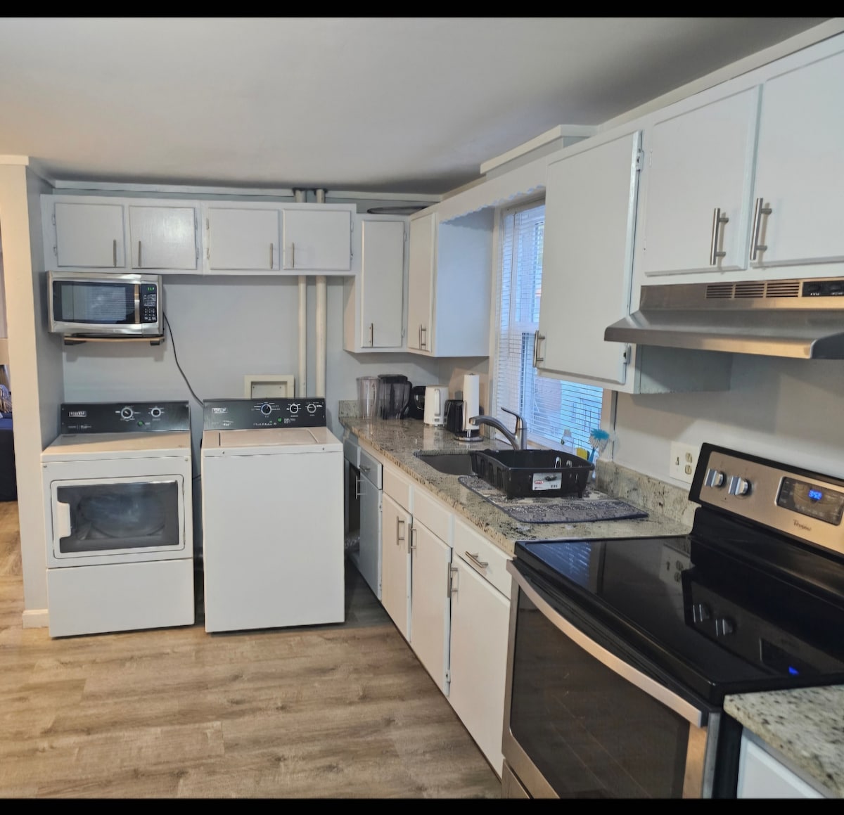 Ground level. Spacious room with a King Bed and a bonus smroom with a ( twin pull out bed) couch and desk/vanity. The sizeable bathroom is freshly remodeled. Kitchenette has a small sink, refrigerator and microwave. It is in a quiet neighborhood only minutes from a rail trail, route 62, interstate 95 route 1 and route 128. Off Street parking. We are 5 miles to Salem Mass, 44 miles to New Hampshire, 77 miles to the cape cod canal, 19 miles to Boston. We are 4 miles to the Beverly train Station.