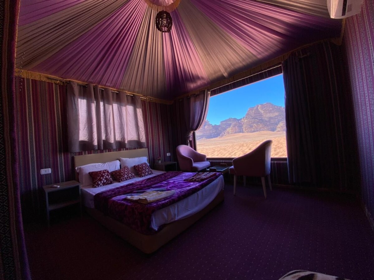 ワディ・ラム砂漠の中心部にある豪華なベドウィンのテントで一夜を過ごそう この豪華なテントには、バスルームと砂漠の素晴らしい景色を望む専用テラスにつながるパノラマ窓を備えた個室にシングルサイズベッド3台が備わっています。 タオル、シャンプー、無料の水をご用意しています。共用スペースでの朝食が含まれています。 当社のツアーをご予約いただかない場合、村からの送迎は1人あたり10JDです。