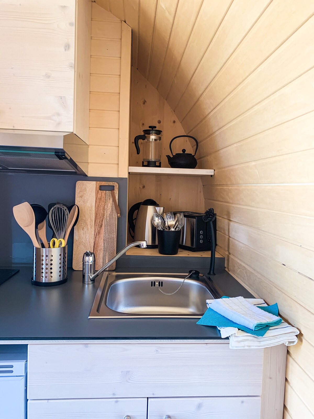 素朴でモダンなインテリアスタイル 基本設備のあるキッチンコーナー ボックススプリングベッド 新しいモダンなバスルーム 夏場は屋外プール、冬場は暖炉(薪は現地で購入可能) 一人旅やカップル、子供連れの方、3人または4人グループに適しています