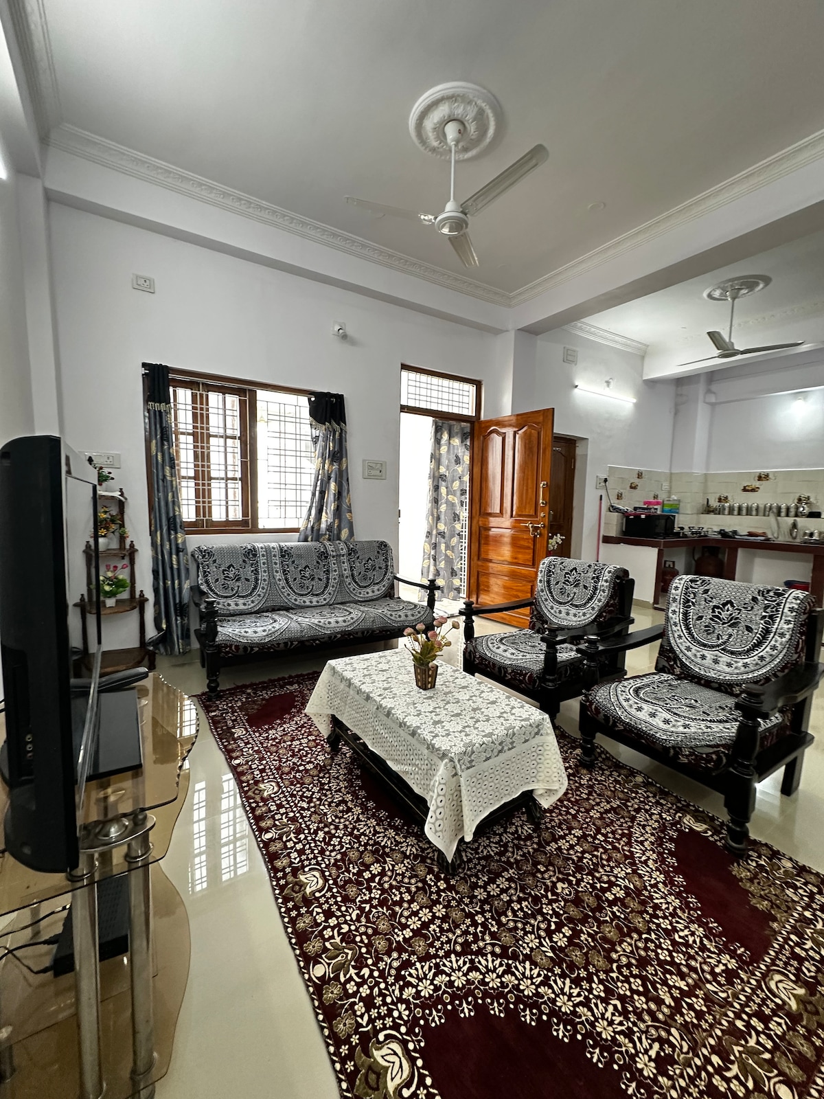 この広々としたスタイリッシュな空間は、友達や家族と一緒に滞在したり、過ごすための広いホールがあり、都心にある素晴らしい場所です。 ハイデラバードの金融街、ウィプロサークル近くのTNGOコロニーにある宿泊先です。 この場所はすべての住民にとって安全です。 このレトロなテーマの家には、完全に機能的なキッチン、まともなインテリアのエアコン付きベッドルームが1室あります。