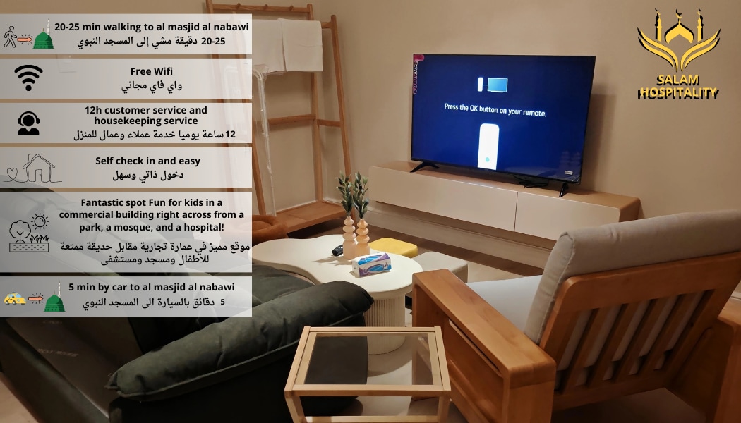 豪華なベッドルーム、リビングルーム、お気に入りの食事を調理するためのフルキッチン、設備の整ったトイレで構成される静かなアパート -預言者のモハマドのモスクから車で5分、クバモスクから車で3分、クバ歩道とジュマモスクに非常に近い 🕌 - すべてのサービス、レストラン、ショップが24時間利用可能です - リラックスできるソファ - 65インチのスマートスクリーン スマート Wi-Fiに接続されており、家族と楽しい時間を過ごすことができます - スマートスクリーンには、NetflixとYouTubeのすべてのアプリが含まれています 新しい宿泊施設へようこそ💜 ご滞在中はお気軽にお申し付けください