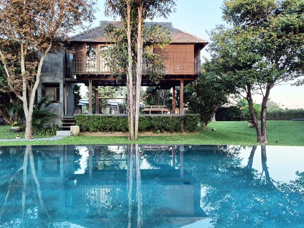 このユニークな家は、ピン川の緑豊かなプライバシーの中にあり、ターペーゲート、ショッピングモール、ニンマンヘミンエリアまで数分です。 寝室は2部屋あり、専用バスルーム、屋根付きの屋外デッキ、プールがあります。カップル、お友達、ご家族に最適です。すべての寝室にはエアコン、Wi-Fi、ケーブルテレビが備わっています。 CNX空港、バス/電車駅、チェンマイ中心部から5 kmの場所まで無料の送迎サービスを提供しています。 追加:ご要望に応じて占星術をご提供します。
