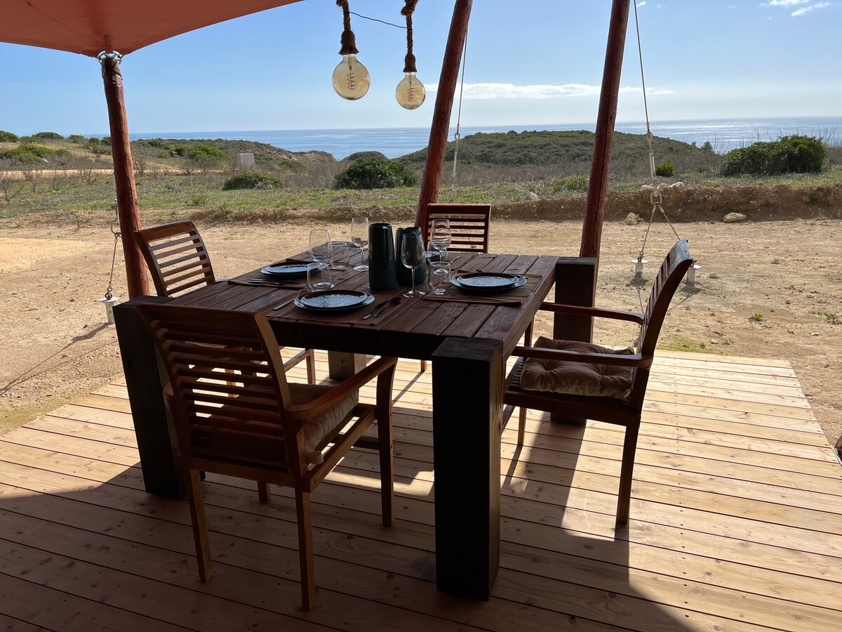 サファリテントは、コスタ・ヴィセンティーナ・エ・スドウエステ・アレンテジャーノ自然公園の自然の真ん中にある丘の上にあります。ベランダからの景色は素晴らしく、自分だけの場所にいるように感じられます。 テントには専用のバスルーム、普通のトイレ、温水と冷水、冷蔵庫とガスコンロを備えたキッチンがあり、生活に必要なものがすべて揃っています。もちろん、夕食に外出することもできますが、ベランダで夕日を楽しむことが、この場所を忘れられないものにしています。