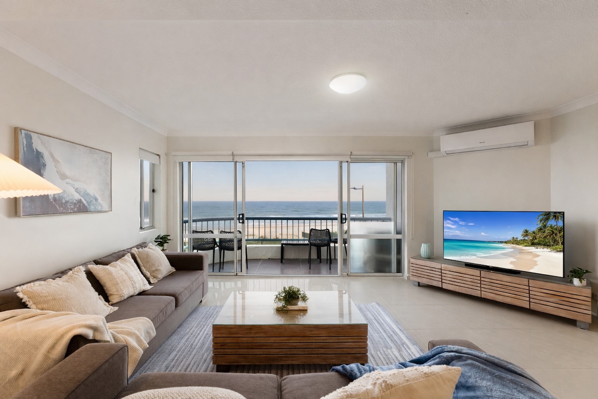 Luxury High Floor ocean side of building. 5 Star experience This luxurious 2 bedroom beachside Apartment has stunning ocean views, FULLY DUCTED air conditioned, refurbished to high standard, new furniture and appliances, quality linens, espresso machine, barbecue, championship tennis court, 2 pools, gym, sauna and spacious grounds. Perfect for couples and families. Don’t be swayed to cheaper inferior apartments here. This apartment is on a premium HIGH FLOOR ocean side of the building.