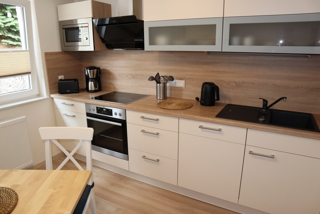 自然の中にある約35平方メートルの小さなワンルームです。 ワンルームマンションには、必要なものがすべて揃っています。大きな快適なダブルベッド、食器洗い機、冷蔵庫などを備えた設備の整ったキッチン、バスタブとシャワーキャビンを備えたバスルーム、ダイニングテーブル、小さなシーティングエリアがあります。 寝室の窓からの眺めは最高です。庭の屋根付き屋外シーティングエリアもご利用いただけます。 1.5km先には、すべてのショッピング施設があるSchöllkrippenがあります。