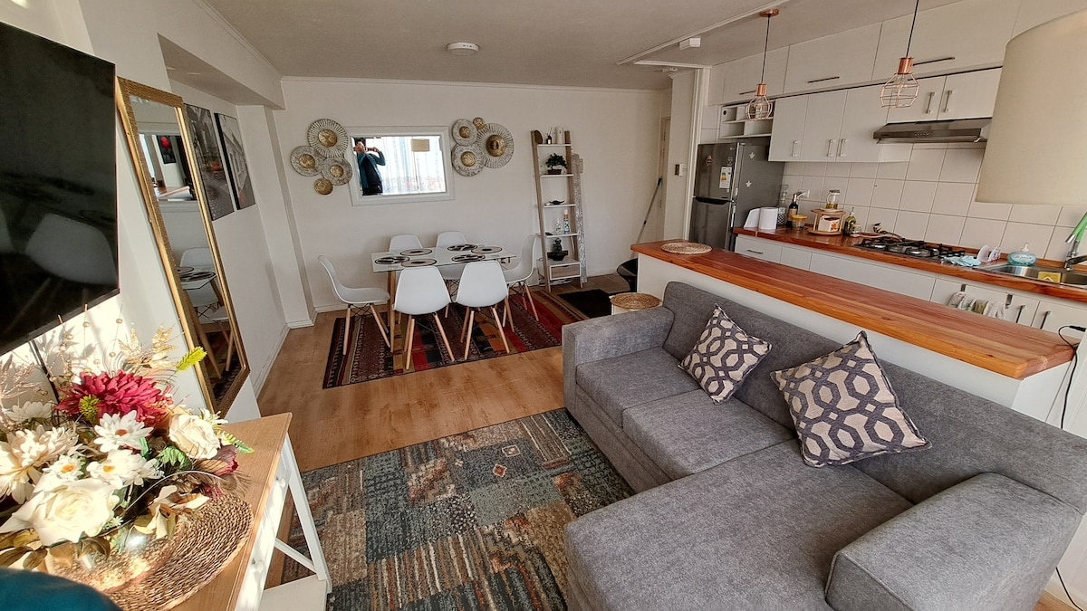 このユニークな休暇でリラックスしてください。 ペレット暖房付きの素朴なアパートメントには、快適でリラックスできるジャグジーが含まれており、ご滞在を特別なひとときにします。 アラウカニアのネイティブペリンとシンボルで飾られています。 5階に位置しています(エレベーターはありません)。駐車場が含まれています。 中心部に近く、カップルに最適です。