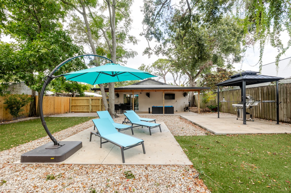 ブレイデントンの静かなリトリートに逃避しましょう!広々として居心地の良い寝室は、モダンなエレガンスで究極の快適さとリラックスを提供します。豪華なベッド(キング1台、クイーン2台)、広々とした収納スペース、ワークスペースや多くの「スマート」機能など、ユニークなアメニティをお楽しみください。XLセクショナルでくつろぎ、ジェットバス、広い庭、スクリーン付きパティオ、設備の整ったキッチン、75インチのスマートテレビをお楽しみください!ダイニングエリアで食事を楽しんだり、ボードゲームや本のコレクションを楽しんだりできます。ブラデントンでの休暇にぴったりです!