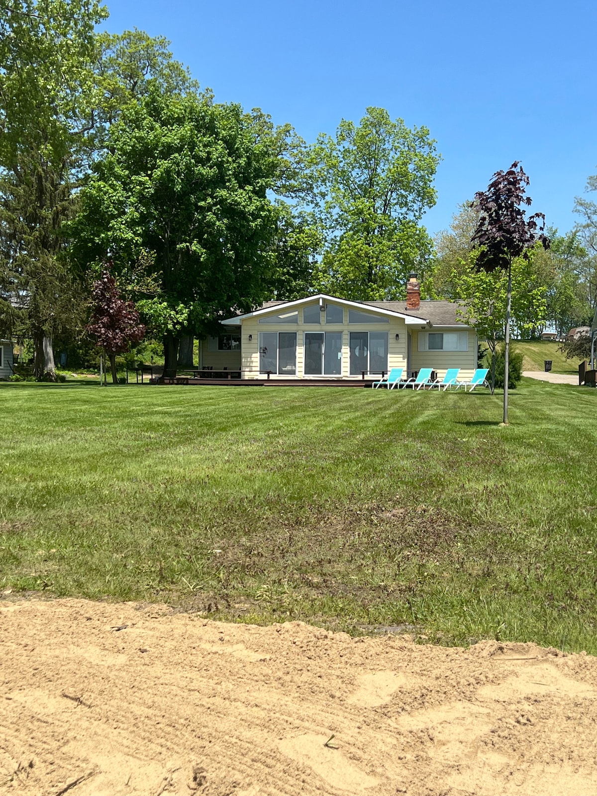 湖畔のリゾートに逃避しましょう。20人以上の大人数の集まり(キャンパーを含む)に最適です。水辺の息をのむような夕日、子どもたちに安全な砂の海岸線、そしてリラックスできる広々とした空間をお楽しみください。広々とした駐車場とトレーラーへのアクセスにより、ボートやおもちゃを簡単に持ち込むことができます。また、キャンピングカー用の電気接続もあります。広々とした家と敷地内は、家族の集まりやお祝い、グループ旅行に最適で、快適さと便利さ、そして湖での楽しみを年齢を問わず提供します。