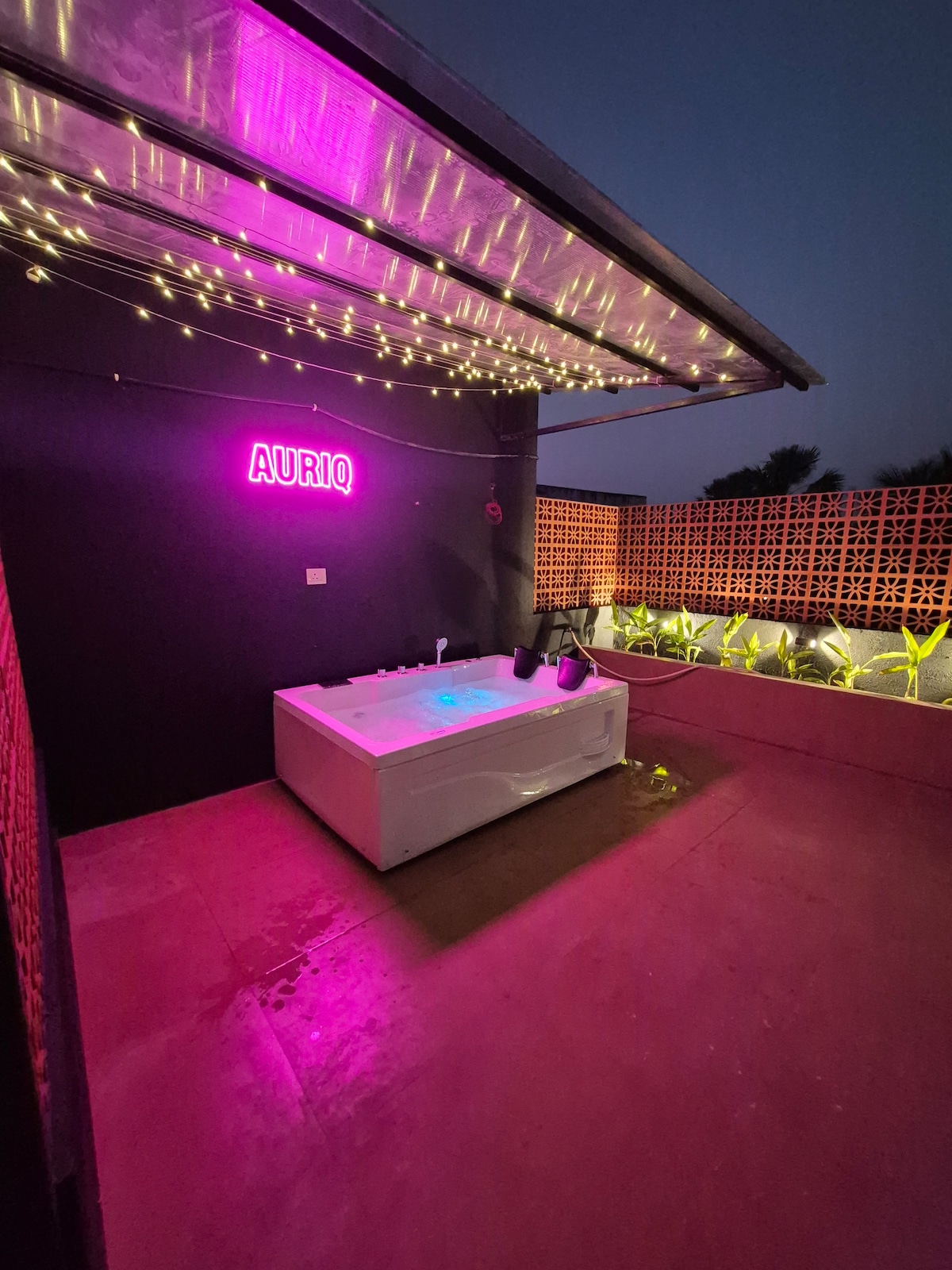 ロマンチックなスタジオステイ|専用テラス|オープンスカイジャグジー 安らぎ、プライバシー、リラクゼーションを実現するために設計された、魅力的な1 BHKスタジオアパートメントに逃避しましょう。閑静な立地にあり、屋外ジャグジーを備えた専用テラスが付いています。ロマンチックな夜や思い出に残る滞在に最適です。 スタジオには居心地の良い寝室、モダンなアメニティ・設備、全体的に穏やかな雰囲気が特徴です。ジャグジーに浸かったり、テラスを楽しんだり、室内でリラックスしたりできます。 カップル、記念日、週末のお出かけに最適です。