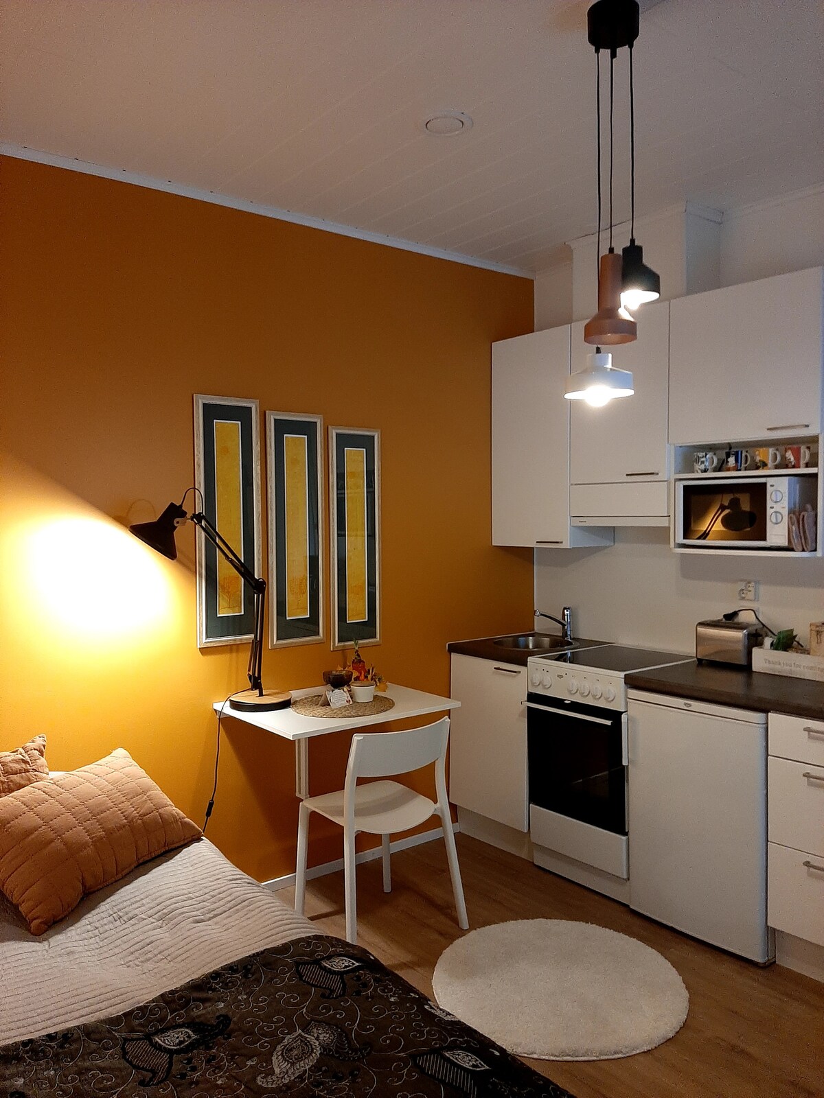 A cozy studio in a peaceful neighborhood, close to downtown Lahti. Within a 10-15 minute walk are Malva, the Travel Center, market square, sports center, harbor, and Sibelius Hall. The studio includes a living area, fully equipped kitchen, and clean bathroom. For extended stays, a washing machine is accessible outside the studio. The window faces the street with some car noise. Parking with a car heating plug is available in the courtyard. Enjoy nearby Lahti outdoor trails!
