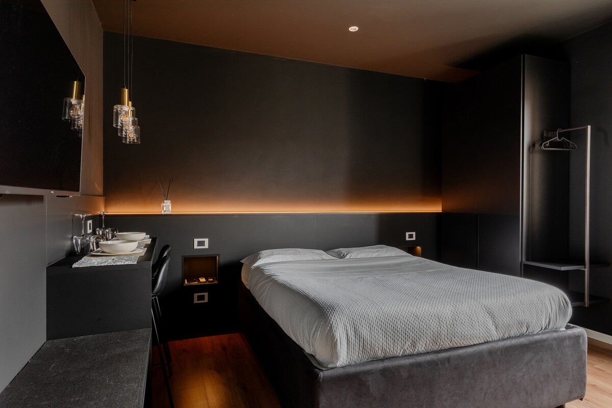 市内でユニークなデザインの豪華な黒いスイートをご利用ください