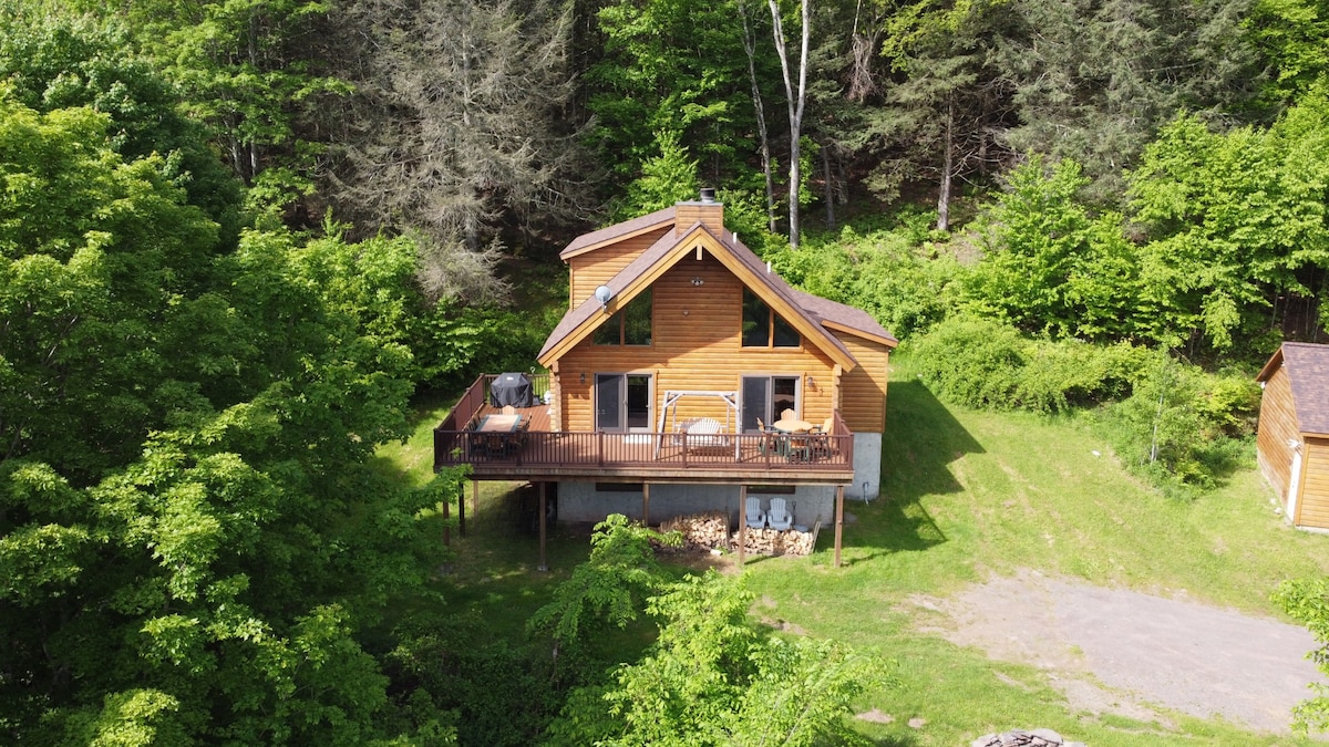 山の眺望を楽しめる、空の上のキャッツキルのログハウス