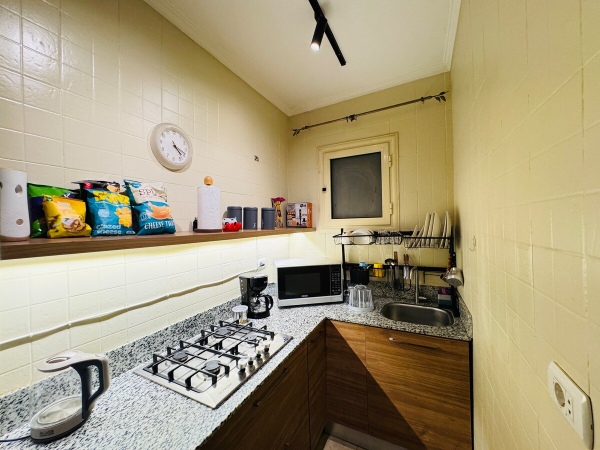 最高の立地にあるスタイリッシュなワンルームマンション・アパート このエアコン完備、エレガントな家具付きのワンルームアパートは、ニューカイロ、ナスルシティ、マーディ、ヘリオポリス、カイロのダウンタウン、国際会議センターの隣にあります。 24時間365日のセキュリティを備えた安全な敷地内にあり、モダンなアメニティ、高速インターネット、設備の整ったキッチンを提供しています。 有名なレストラン、カフェ、必須サービスに囲まれ、短期滞在と長期滞在の両方のゲストに快適な滞在をお約束します。
