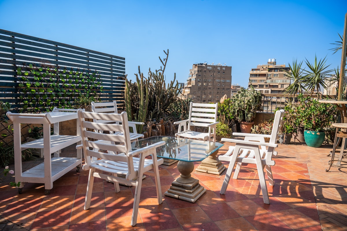 南ザマレクの高級エリアにあるナイルのヴィンテージジェムへようこそ。ナイルのパノラマビュー、カイロの中心部にある十分な光と太陽を備えた魅力的な隠れ家で、カップル、家族、友人、または一人旅の冒険者など、すべての旅行者に対応しています。 アパートは新品の家具と折衷的な装飾が特徴で、ソファでくつろぐのに最適です。また、息をのむようなナイルの景色と壮大なピラミッドを垣間見ながら、朝のコーヒーを楽しむことができます。