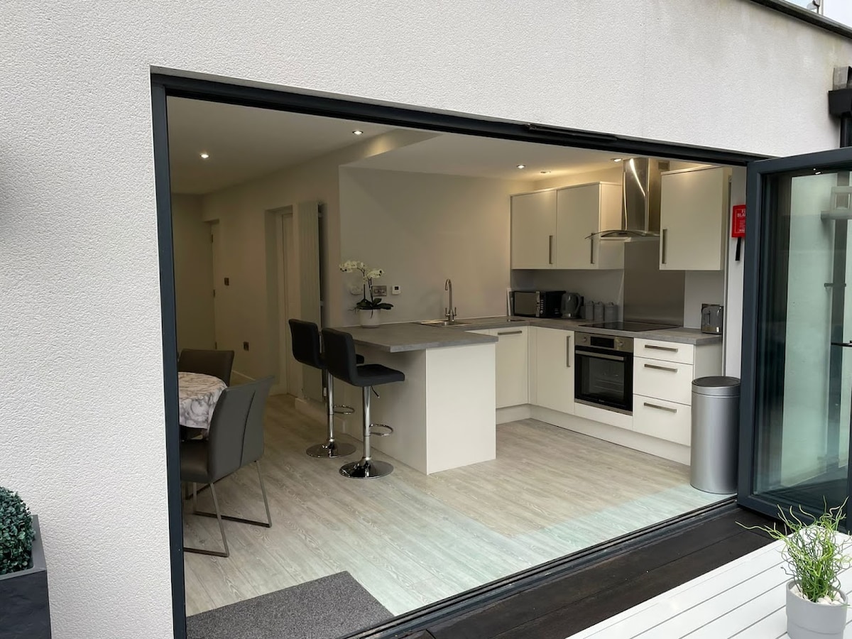 A stylish one-bedroom apartment with a 22kw electric car charger on its private parking area right outside the door! It offers comfortable accommodation for 2/4 guests with either a king-sized bed or two single beds, providing flexibility for sleeping arrangements, and a sofa bed in the living area. Conveniently located with a coffee shop opposite -perfect for breakfast- and walking distance to shops and restaurants.We accept max 2 dogs at a charge of 20 GBP per dog per stay payable to the host.