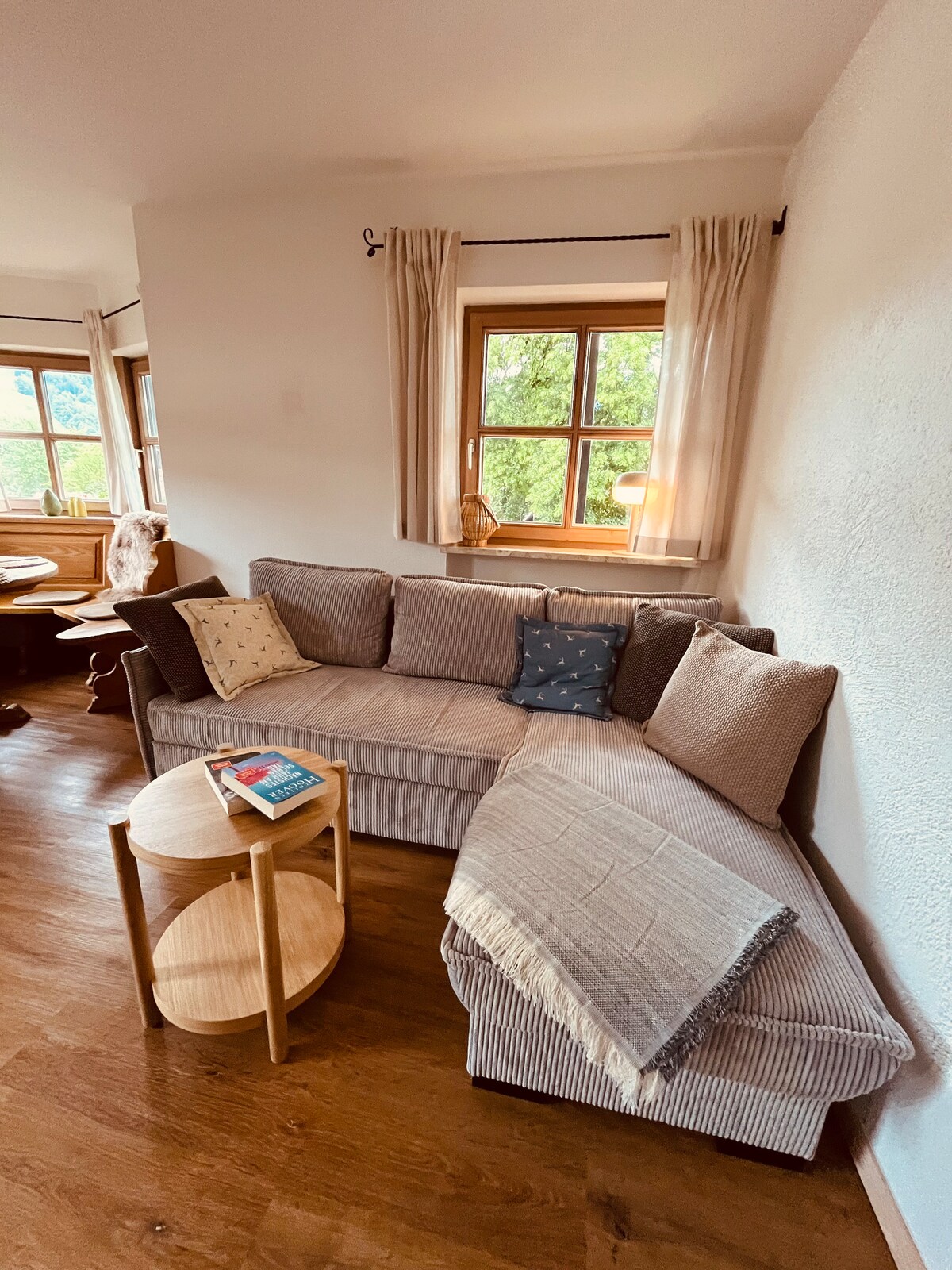 Die ca. 53 qm große Wohnung liegt sehr ruhig und malerisch am Fuße der Alpen. Sie ist liebevoll in einem Mix aus bayrischen und modernen Stil eingerichtet. Die Wohnung verfügt über einen großer Wohn- und Essraum, eine separate Küche, ein schönes Schlafzimmer mit Blick auf die Berge und ein helles, geräumiges Bad mit Wanne. Für ausgedehnte Frühstücke und Abendessen eignet sich der geräumige Eckbalkon mit Bergblick.