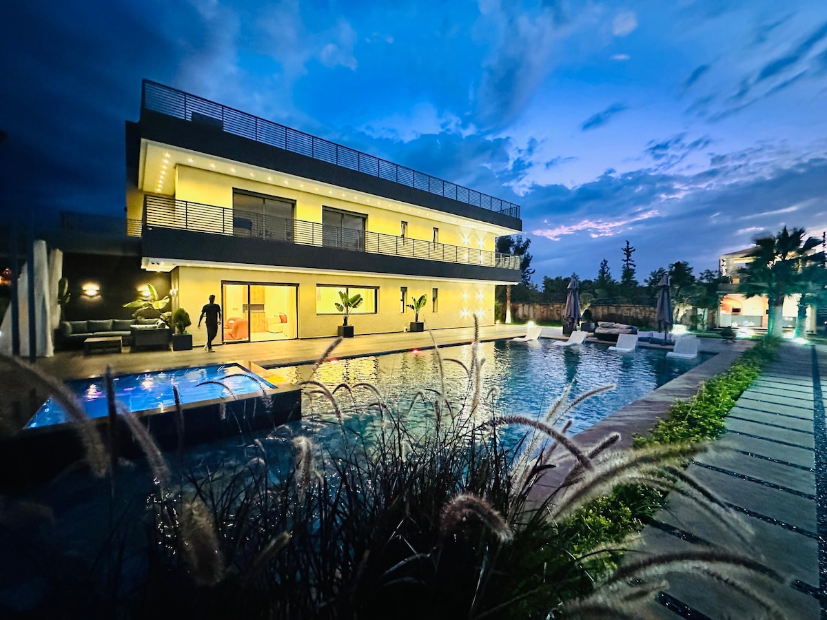 このユニークで静かな住居の中で、ゴルフ場の中でリラックスしてください。このファミリー向けの宿泊施設は、中心部に位置しており、すべての場所や施設へのアクセスが簡単です。広々とした空間と複数のプールを備えたこの美しい木々に囲まれた敷地は、忘れられない滞在をお約束します。敷地内は完全に警備されています。空港から数分、ジャマ・エル・フナ広場から5分、メナラ庭園から2分です。