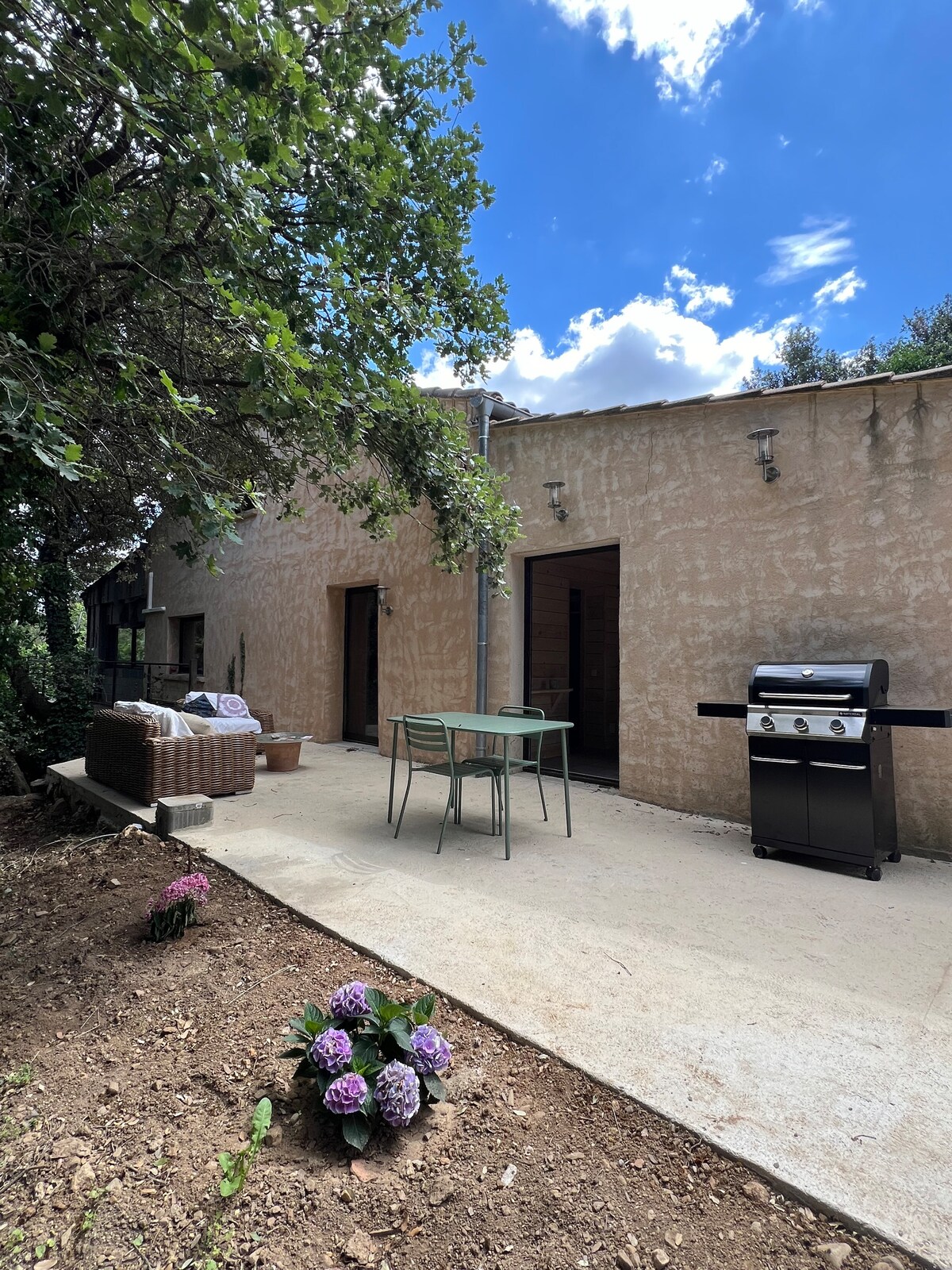 すべての設備が整った村の専用中庭にある独立した部屋です。ラマルー レ バンから 3 km、グリーンウェイ (ベダリュー - マザメ サイクリング コース) から 150 m、ソナイユ博物館から 100 m、カルー山 (登山、マウンテン バイク、ツリートップ アドベンチャー コース、カヌー、エリック渓谷、コロンビエール渓谷、多数のハイキング コース) の麓にあります。モンペリエから 70 km、ワイナリーが数多くある観光地ベジエから 37 km、ゴルフ コースから 1 km、サンティアゴ巡礼路 (サンティアゴ巡礼の道) の停留所から 8 km、ロデーヴから 14 km です。