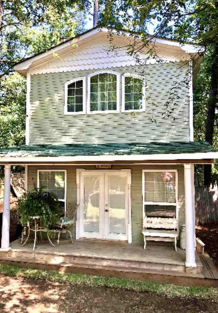 The cottage is nestled in the pines 20ft from main house 800 sq. ft. 2-story cottage has security And white lights from main house for light… Eclectic in style with a vaulted ceiling in the large upstairs bedroom. Downstairs- the Liv/Kitchenette space has TV & sofa sleeper. *Note- One cottage bathroom is located on first floor. We are off HWY 59 and 1 mi. from I-20 ( near all local restaurants) Caddo Lake St Park-30 min drive, Historic Jefferson & Enochs Stomp Winery both 20 mi.