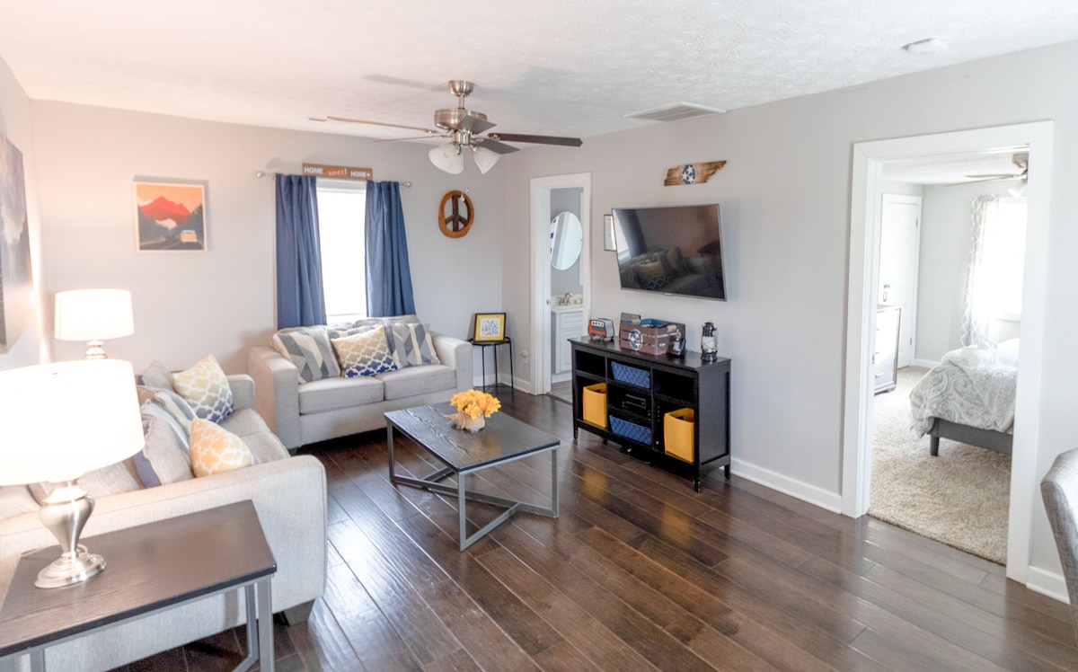 ヒルトップ・ハイドアウト・空港から10分・フルキッチン・高速Wi-Fi + ケーブル付きスマートテレビ・スモーキー山脈まで30分・スーパーホスト4人!