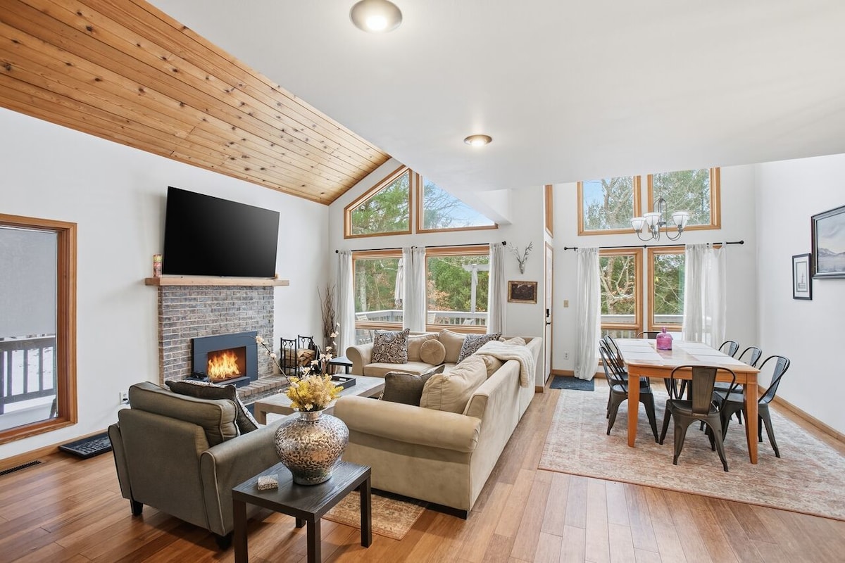 森の中にある快適で隣接したバリアフリーのアパートで、専用の入り口があります。 クイーンベッドを備えたベッドルーム1室と、リビングルームのクイーン折りたたみソファベッド。シャワー付きのバスルームが1つあります。 キッチン、Wi-Fi、ストリーミングテレビ、子供や犬のための広い庭が完備されています。屋内、季節限定プール、5月~9月は温水。 森を見下ろすデッキには、年間を通して使えるホットタブがあります。 人里離れたとても静かな場所ですが、ダウンタウン、ショップ、レストラン、ビーチ、州立公園からわずか10分で行けるので、どこへでも近いです。