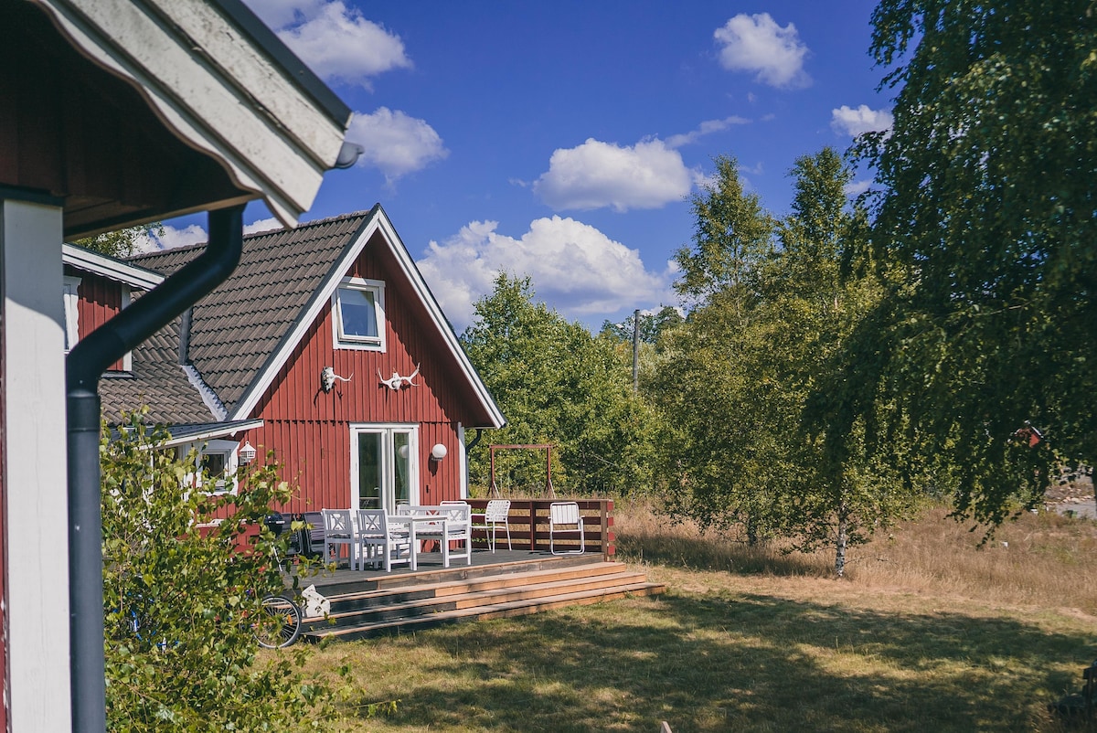 Experience the Småland idyll Ramnäs. With a 5-minute walk to the beach where you can enjoy the sun/swimming, fishing, canoeing. Around the knot, there is the forest for those interested in the outdoors, Ikea Musem 1.7 km away. Our cozy newly built cottage with plenty of space to hang out, 3 bedrooms offers 7 sleeping places. Hot tub on the terrace, sauna and a lovely outdoor grill and pizzaowen for a cozy hangout. The rent includes 1 canoe for 3 per person, and bicycles to borrow.