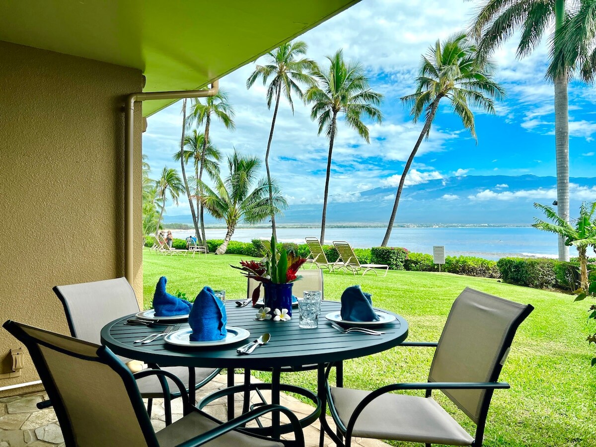 マウイ政府が承認した短期レンタル - ホテル地区 - 1階の広々としたラナイからビーチに直接アクセスできます。カアナパリビーチに直接面したビーチフロントのコンドミニアム。1ベッドルーム、ソファベッド1台、1階に入り口があり、信じられないような景色が楽しめます。中央エアコン、ラウンジとベッドルームはラナイに直接歩いて行けるようになっており、15歩でビーチに行けます!75インチテレビ、Sonosシステム、Apple TV、洗濯機・乾燥機など。キッチンにはコーヒーメーカーや備品が備わっており、夕日を眺めながらロマンチックなディナーを楽しむことができます!