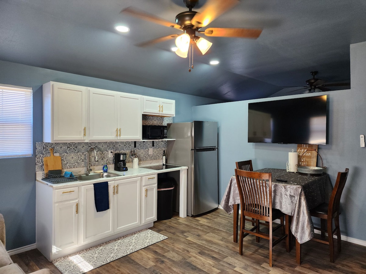 家族全員がのびのび楽しめる最高の宿泊先です。ぜひ、みなさまでお越しください。この広々とした800平方フィートのワンルームゲストハウスには、クイーンサイズのベッド1台とシングルベッド2台が備わっており、柵付きの庭と、家の裏にある専用ゲート付きの専用駐車場があります。スタジオは4名様用に設備されており、イーグルパスの中心部まで車でわずか10分です。 バーベキューグリル付きのパティオエリアがあり、どんなシチュエーションでも滞在を完璧にします。