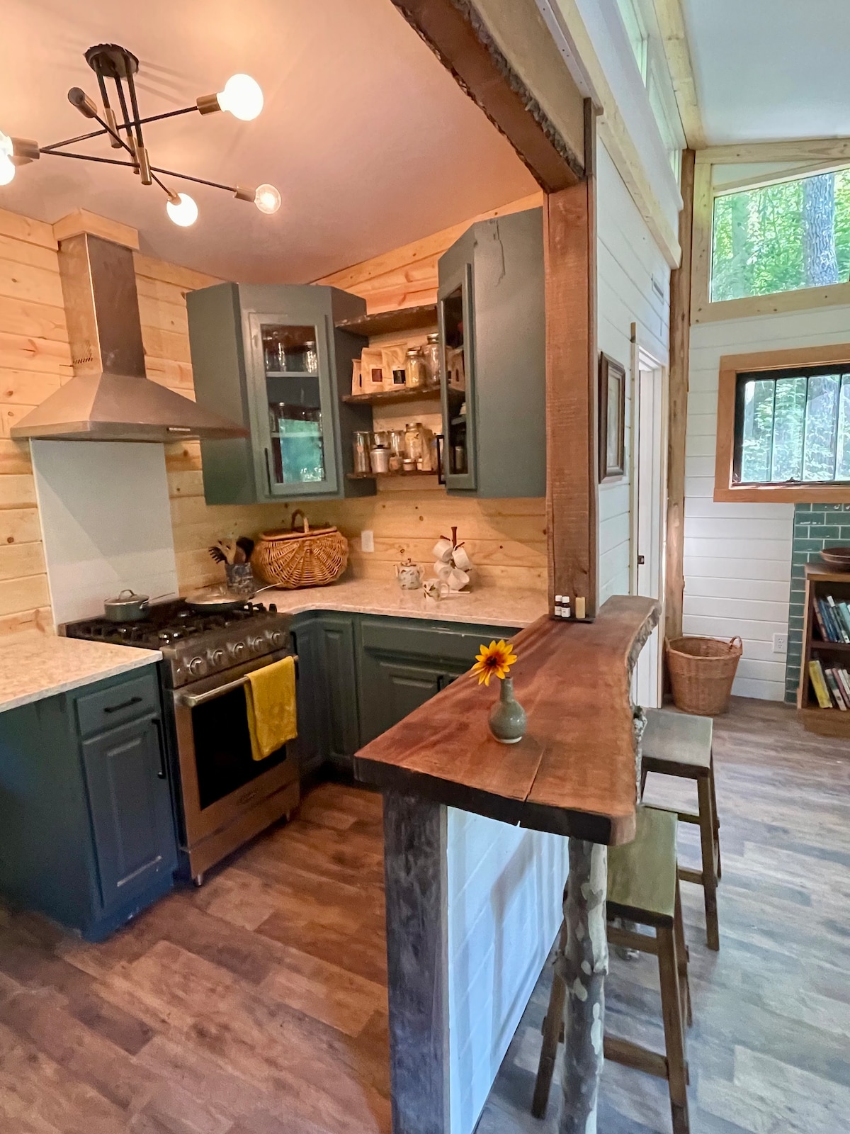 Clear Branch Cottage is 750 sq. feet with 180 sq. feet of covered porch totally surrounded by forest, which can be enjoyed sitting on the porch or inside with large picture windows and views throughout. It has one bedroom with a queen bed, and a trundle bed with 2 single mattresses. A comfortable living room with mid century decor adjoins the well equipped kitchen. The porch has a dining table with additional seating. The private backyard has a gas grill, plenty of seating and a fire ring.