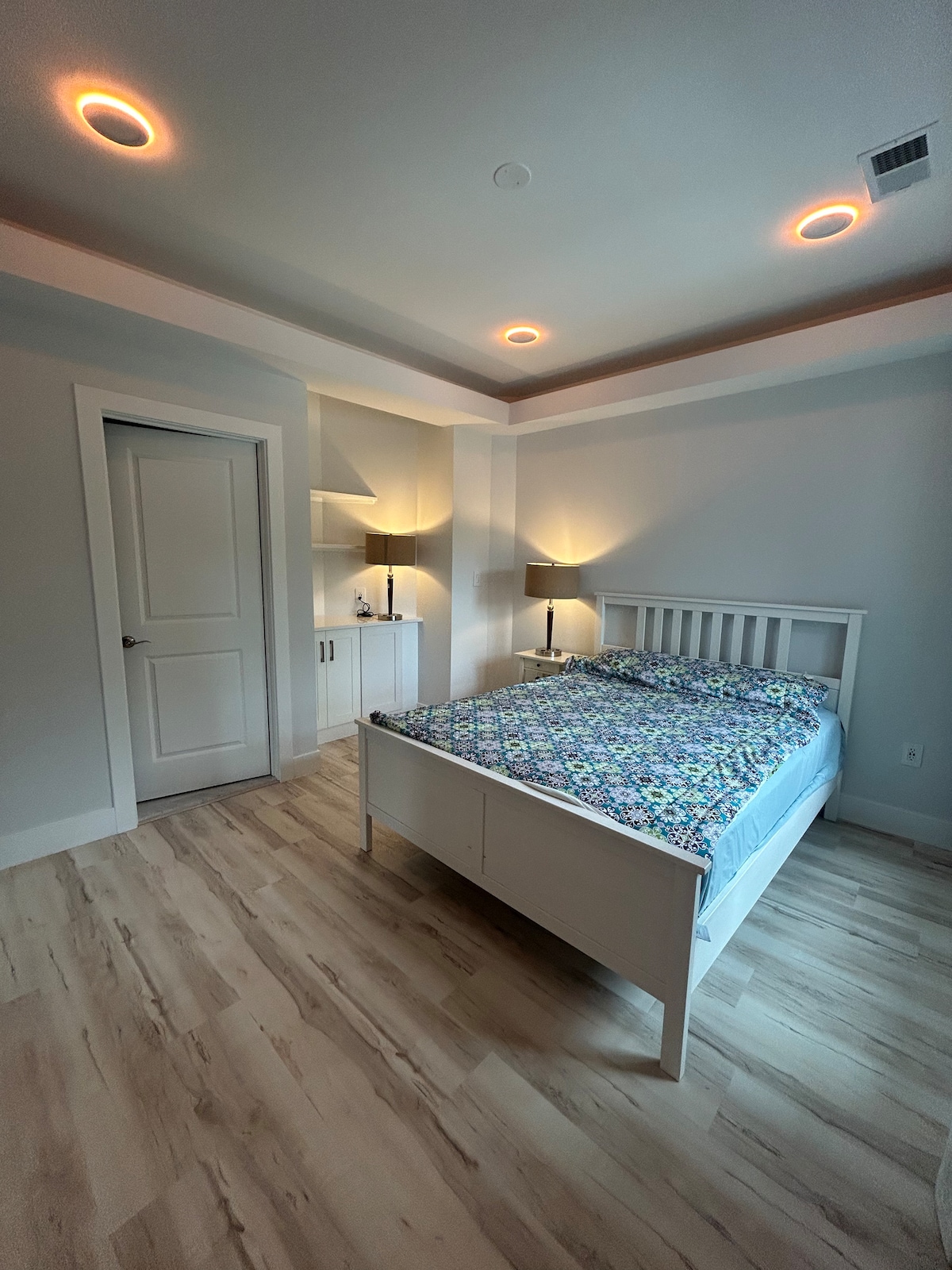 新築の一軒家にある専用の1ベッドルーム/1バスルームのゲストスイート/アパート(600平方フィート)。ゲストスイートは家の上階にあり、玄関ポーチから入ると、玄関ホールからエレベーターでアクセスできます。居心地の良いリビングエリア、寝室、キッチンが完備された、専用の1ベッドルームアパートのような感覚です。キッチンにはフルサイズの冷蔵庫、食器洗い機、電子レンジ、カウンタートップ電気バーナー、コーヒーメーカー、ケトル、食器、お皿、カップ、グラスが完備されています。