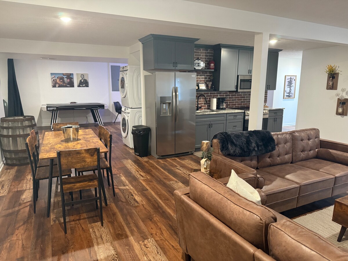 この美しい新築のプライベートゲスト用宿泊施設でリラックスしてください。専用玄関、オーナー/メインホームとの共有壁。こちらのユニークで静かな宿泊先で、プライベートのクイーンロフトルーム、リビングルーム、キッチン、フルバスルームをお楽しみください。 出張、ロードトリップの途中での立ち寄り、一人旅など、リラックスするのに最適です。 ミニ冷蔵庫、電子レンジ、ケトル、コーヒーメーカーが備わっています。 螺旋階段を上ると、クイーンベッドがあるロフトにつながります。