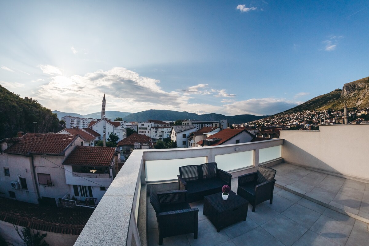 モスタルの旧市街にあるモダンでありながら魅力的なヴィラの最上階にあるユニークな2ベッドルームのペントハウスです。 ペントハウスには、山、川、ユネスコ世界遺産の「スタリモスト」(旧橋)を一望できる広いテラスがあります。 徒歩数分以内に、モスタルの旧市街の中心部に到着します。 ヴィラの近くには、本格的なパン屋さんもあり、必須のボスニア風ピタを買ったり、居心地の良いカフェでコーヒーを楽しむことができます。 暖かくお迎えします!