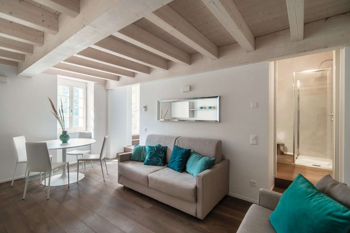 indipendent apartment in historical building, all new and ready-furnished * breakfast service on request, 5€/p/d * max 4 people * international TV and free internet * sleeping room with double bed and wardrobes * bathroom with small bathtub/shower, washing machine/tumbler * living with 2 sleeping-sofas, table with 4 chairs and a working desk * near Mendrisio, Stabio, Balerna, Monte Generoso, Monte San Giorgio, Como (I), Accademia di Architettura, Fox Town