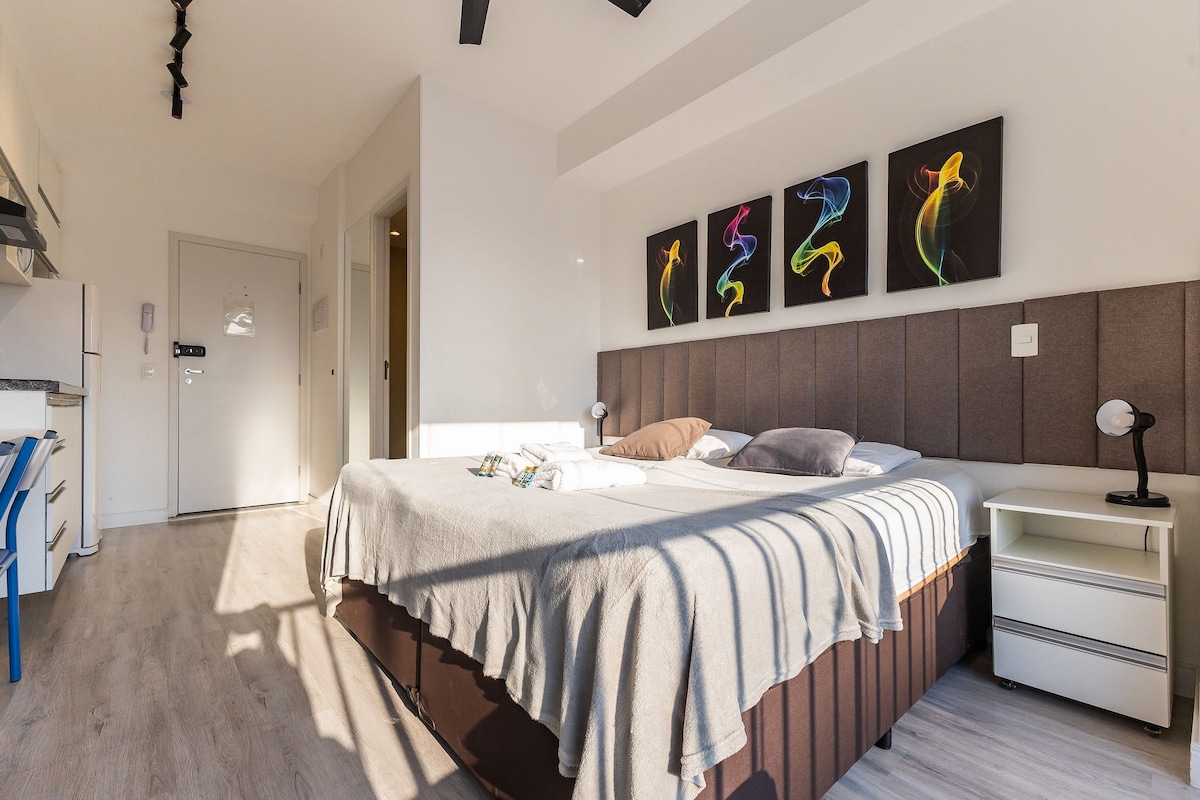 スタジオは10階にあり、テラスと壮大な夕日が見えます。 素敵なひとときを過ごしていただくために、心を込めてご用意しました。 パン屋、市場、商店など、あらゆる場所に近いです。 ベラ・ヴィスタの静かな通りに位置し、 ブリガデイロ・ルイス・アントニオ通りと平行しており、周辺には24時間営業の駐車場がいくつかあります。 あなたをホストすることを楽しみにしています!
