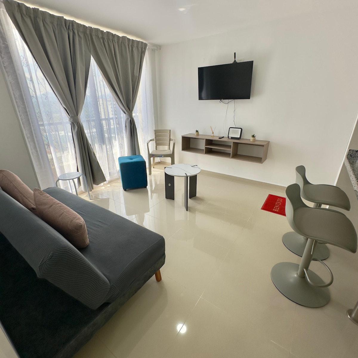 Moderno apartamento en altos de cabecera, cerca de universidades y centros comerciales, ideal para descansar, trabajar o turistear, cuenta con cama queen sabanas 300 hilos, aire acondicionado, cocina equipada , zona de trabajo, sala con tv y equipo de sonido. Acceso a terraza , lavandería, parqueadero no cubierto, maquina dispensadora de snack y bebidas. Cerradura digital. Bienvenidos!