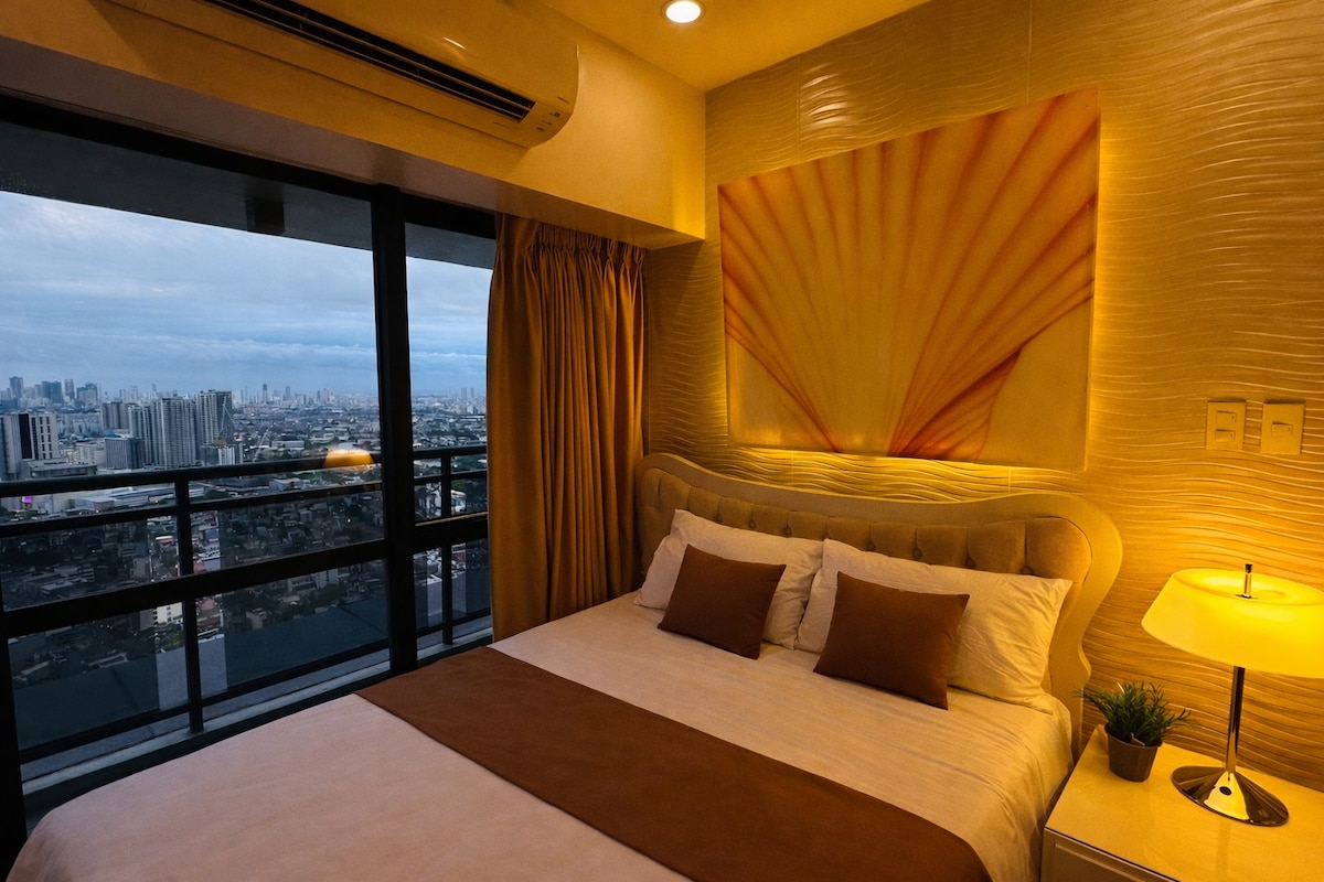大人4名様+お子様に🌟最適な、アップタウン・パークスイーツ・タワー1のスタイリッシュな1ベッドルームには、柔らかい羽毛布団を備えたキングサイズのメインベッドとクイーンサイズのラウンジソファベッド、窓際のリラックスできるフットマッサージャー、フルキッチン、洗濯機・乾燥機、超高速500mbps Wi-Fiが備わっています。BGC、グランドハイアット、マニラの素晴らしい夕日とスカイラインビューをお楽しみください。忙しい1日の🌃後、街の灯りを眺めながら、快適なラウンジチェアやソファでリラックスしましょう。アップタウンモール、ミツコシ、ランダースまで徒歩✨わずか1分です。 🥳🤍