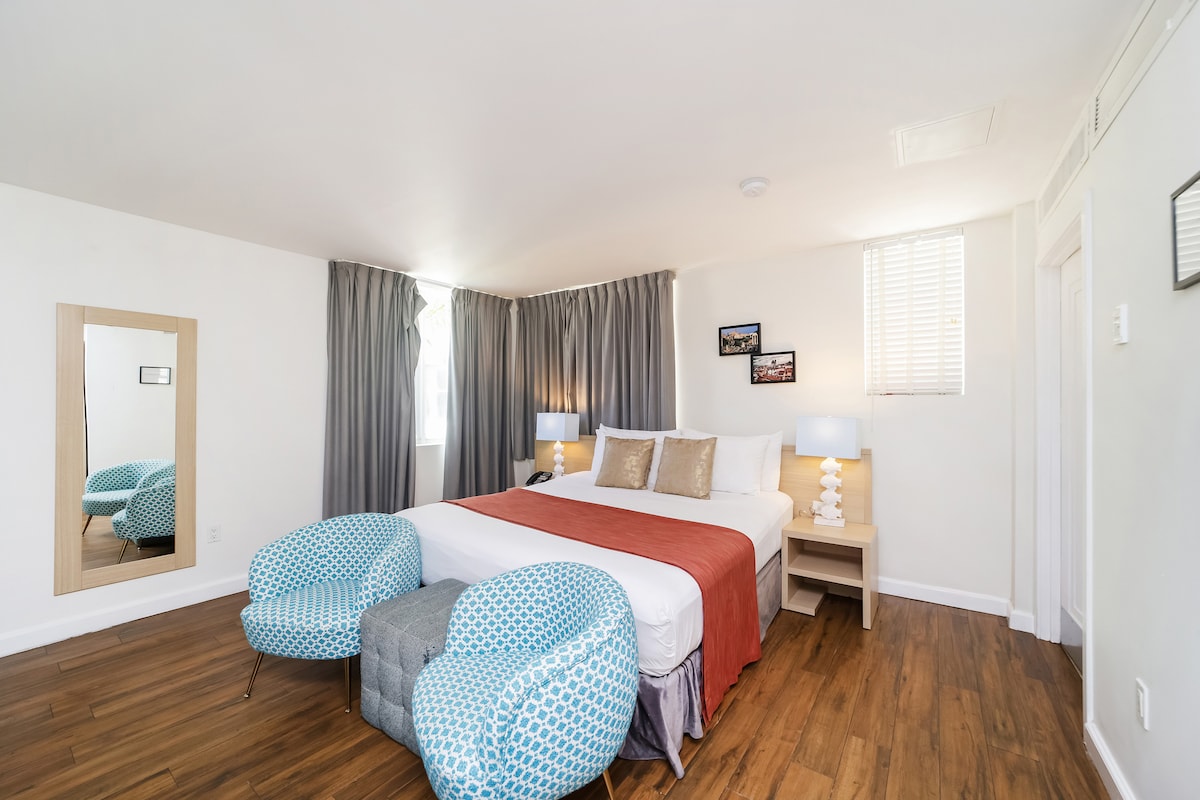 Experience refined luxury in this newly renovated South Beach suite, just one block from the Ocean. Perfect for leisure or business, it features a plush King bed (or two single beds upon request), high-speed Wi-Fi, Smart TV, and a dedicated workspace. Thoughtful touches include a wardrobe with hangers, iron, and ironing board. Secure gated parking is available nearby for $20 per day—offering style, comfort, and convenience in the heart of South Beach.