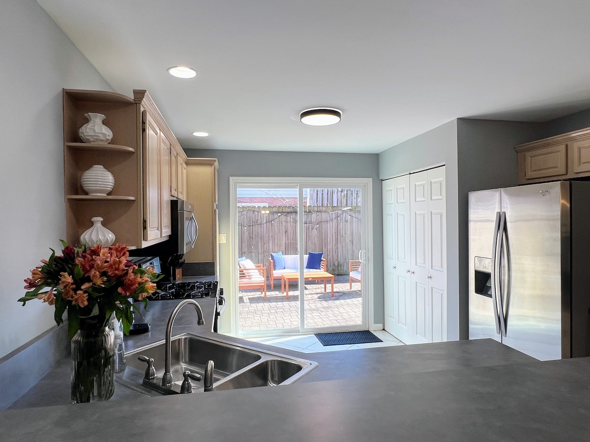 この改装されたスタイリッシュな2ベッド/1.5バスルームの1階建てゲストハウスは、仕事、団体旅行、楽しみ、または家族訪問に最適です。 キッチンには、食器、調理器具、基本的なパントリー(油、調味料、砂糖、小麦粉)が備わっています。 K-Cupとコーヒーフィルターを備えたKeurigシングルサービングとカラフェコーヒーメーカーをご用意しています。 ゲストハウスには、2つのリビングスペース、ダイニングルーム、キッチン、洗濯機と乾燥機を備えたユーティリティルーム、屋外座席を備えた専用パティオ、グリルがあります。