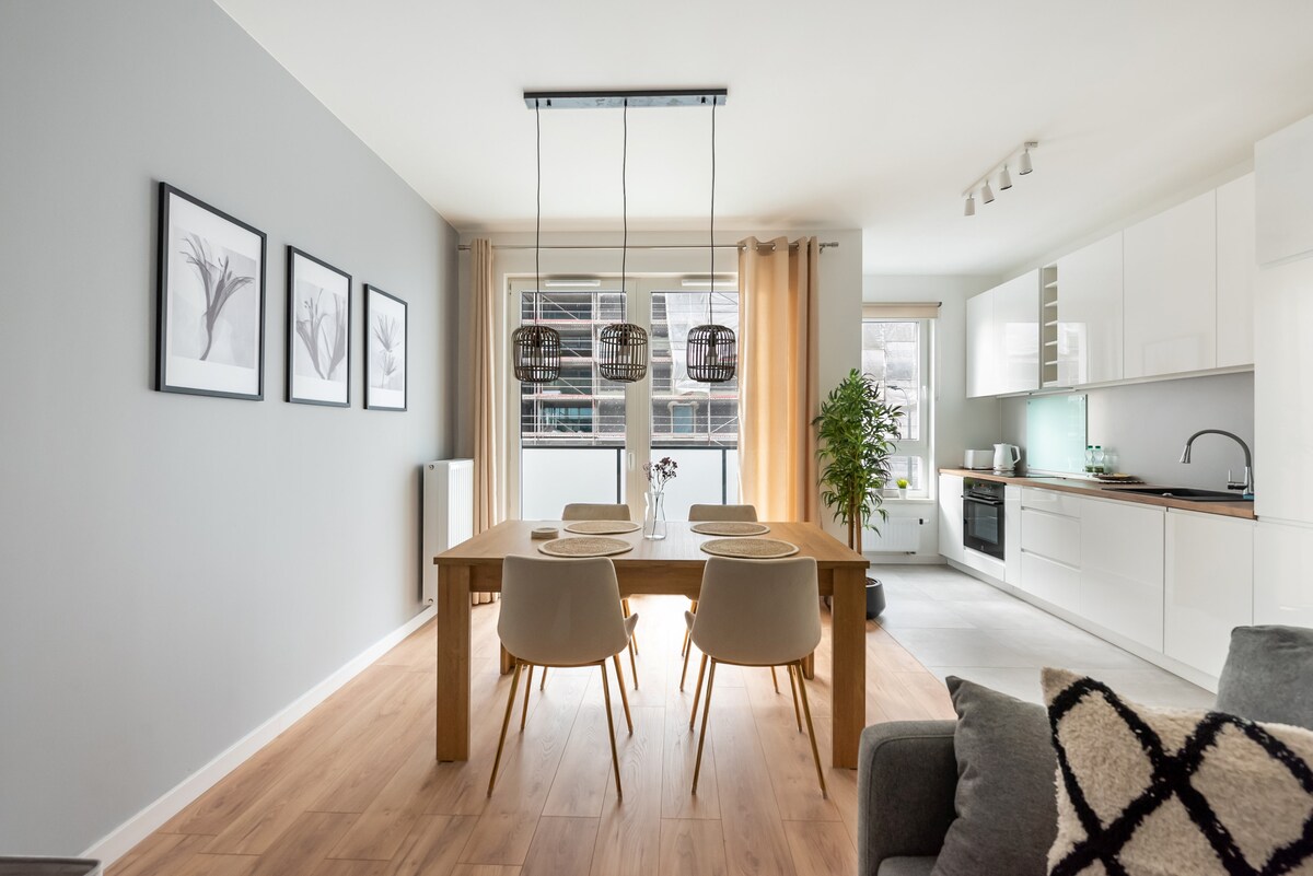 Zapraszamy Cię do zamieszkania w naszym nowym apartamencie, który przygotowaliśmy z myślą o Twoim komfortowym pobycie. Mieszkanie usytuowane w nowym osiedlu na granicy centrum, urządzone i wyposażone jest tak, aby goście mogli czuć się tu wygodnie zarówno podczas urlopu jak i pobytów służbowych. Dogodna lokalizacja pozwala bardzo szybko dotrzeć do głównych miejsc w Warszawie, a także łatwo dostać się w 10 min do lotniska oraz stołecznych dworców kolejowych.