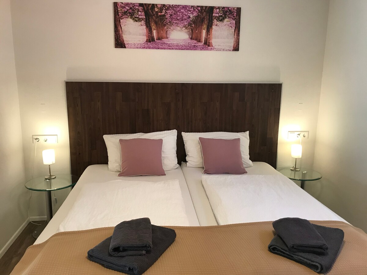 2-Zimmer Souterrain-Wohnung/1 bedroom basement apartment. Hinweis: Eingeschränktes Tageslicht an trüben Tagen. Bitte nur buchen, wenn das für Euch okay ist. Please note: Limited daylight on cloudy days. Book only if this is okay for you. Modern eingerichtete 2-Zimmer Wohnung (45qm) für bis 3 Personen. Mit Küchenzeile, 55-Zoll TV, ein Doppel-Bett, Schlafsofa, Sofa, Kleider-Schrank, Eßtisch, Bad mit Rainshower-Dusche (neue Sauna gegen eine Gebühr von 15€ pauschal)