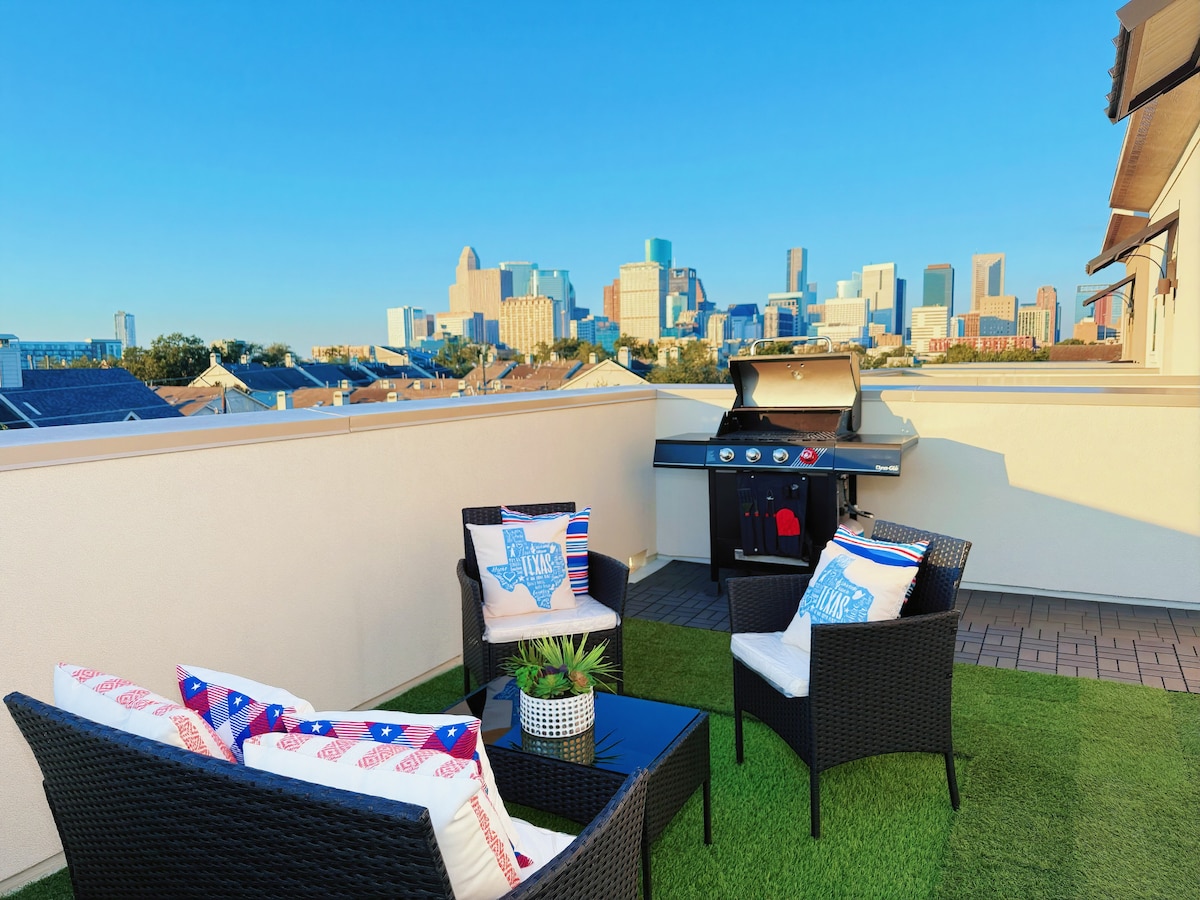 ダウンタウンにあるこの新築の家で、現代的なヒューストンの贅沢を体験してください。ジョージ・R・ブラウン・コンベンションセンター、トヨタセンター、メドセンター、ダイキンパーク(ミニッツメイドパーク)までわずか4分です。 6人乗りのホットタブスパ、ファイヤーピットラウンジ、デザイナーサンラウンジャー(パラソル付き)を備えた専用屋上オアシスからスカイラインビューをお楽しみください。 Chapman Kirby、The Breakfast Klub、Taste Bar & Kitchen、Lost & Foundなどの人気スポットの近くにあります。ここからNRGスタジアム&ミュージアム地区にも行けます!