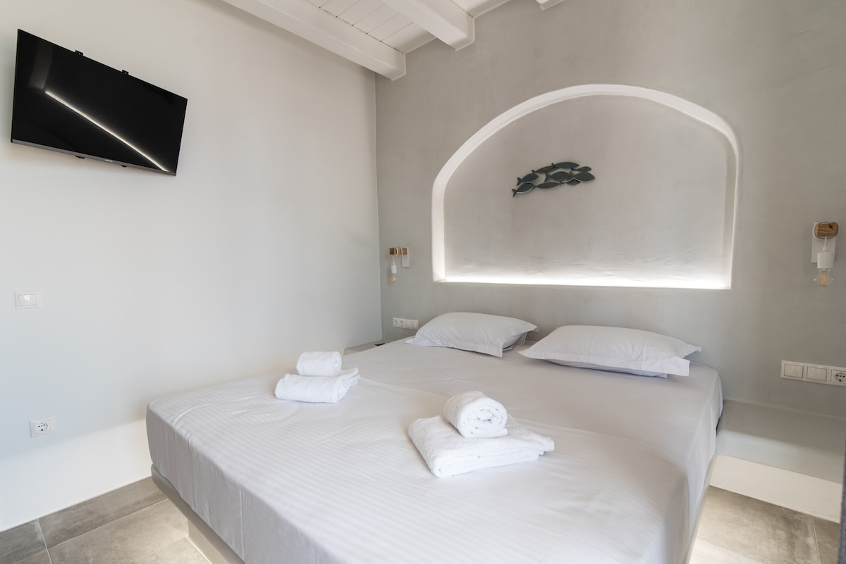 1階建てのヴィラで、床面積は43平方メートル、ダブルベッドの寝室、ウォークインレインシャワー付きのバスルーム、ソファベッドを備えた独立したキッチン/リビングルームがあります。庭園の屋外座席エリアと、海とナクソス町の景色を望む屋上テラス。