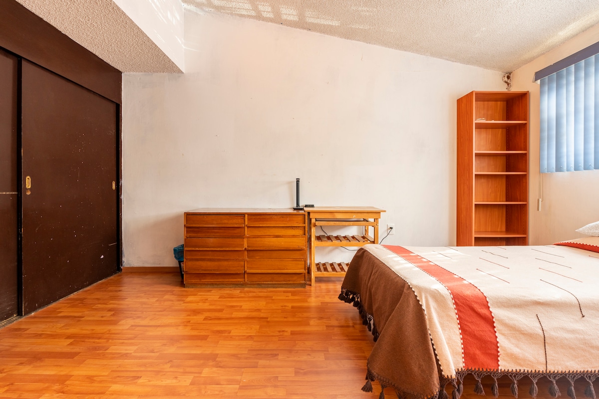 Tranquilo y muy bonito sur CDMX a 7 km estadio azteca y unos minutos de Six Flags. Sofá cama para 2 niños (6/16) Seguridad 24/7 Iluminado con luz natural, cocineta, comedor, terraza y sala de tv integral Recámara con vestidor y recibidor. 1 completo y 1/2 baños Zona de trabajo con Internet A unos metros. Pista para correr y aparatos para ejercitar al aire libre, simplemente caminar y contemplar las áreas verdes. Estacionamiento frente a la casa. Nuestros perros Benito, Gru y Toto