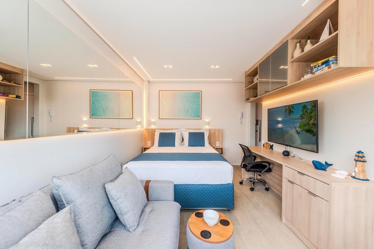 豪華なワンルーム(キャナル5ビーチ)、17階、サイドシービュー。 設備が整っています(コンロ、オーブン、調理器具、電子レンジ、乾燥機、エアフライヤー、トースター、65インチスマートテレビ、Xbox S、ピアノ)。 リモートワーク:高速インターネット、高級チェア、超ワイドモニター。 2名様に最適です。 折りたたみ式ダブルベッド(エママットレス)とソファベッド、メモリーフォーム枕があります。 長期滞在の場合は割引(週割と月割)。