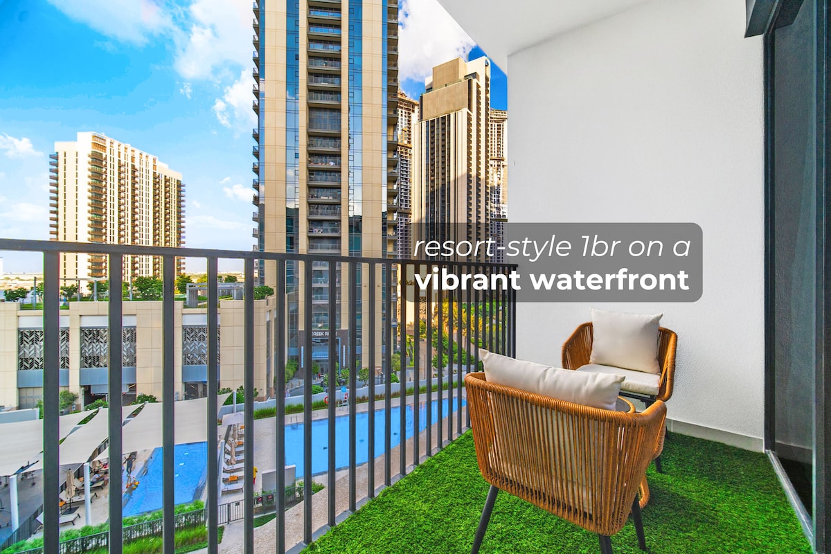 ドバイ・クリークハーバーにあるプールサイドの豪華な2寝室の天国