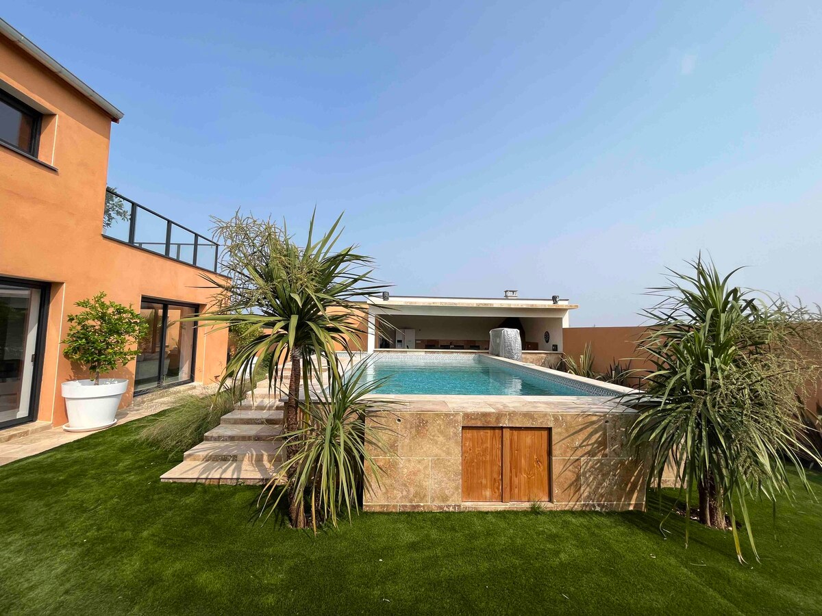 ミレペセの町にあるこの壮大な200平方メートルの新築ヴィラは、ミディ運河からすぐのところにあり、エアコン、プールハウスに面したプールに組み込まれたバーを備えた専用プールを備えています。 プランチャ、アメリカンフリジフリーザーなどを備えた夏用キッチン、 光に満ちたリビングに面した、設備の整った美しいキッチン。 専用バスルーム付きの5つのベッドルーム。リネンは提供されています