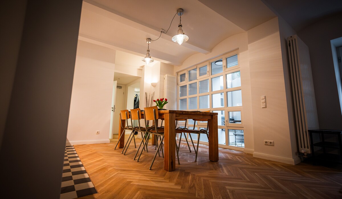 ベルリン中心部(ベルリン・ミッテ地区)の主要駅に近い、スタッコと高い天井の古い建物にある160平方メートル(または1700平方フィート)の美しいアパートです。 長いテーブルがある、素敵に改装されたキッチン兼リビングルームは、友達との集まりに最適です。 Wi-Fi、リネン、バスタオル、ハンドタオル、肌に優しい石鹸、グリーンガスと電気が含まれています。 追加料金はありません。 私たちは家族連れを歓迎しています。12歳までのお子様は無料です。
