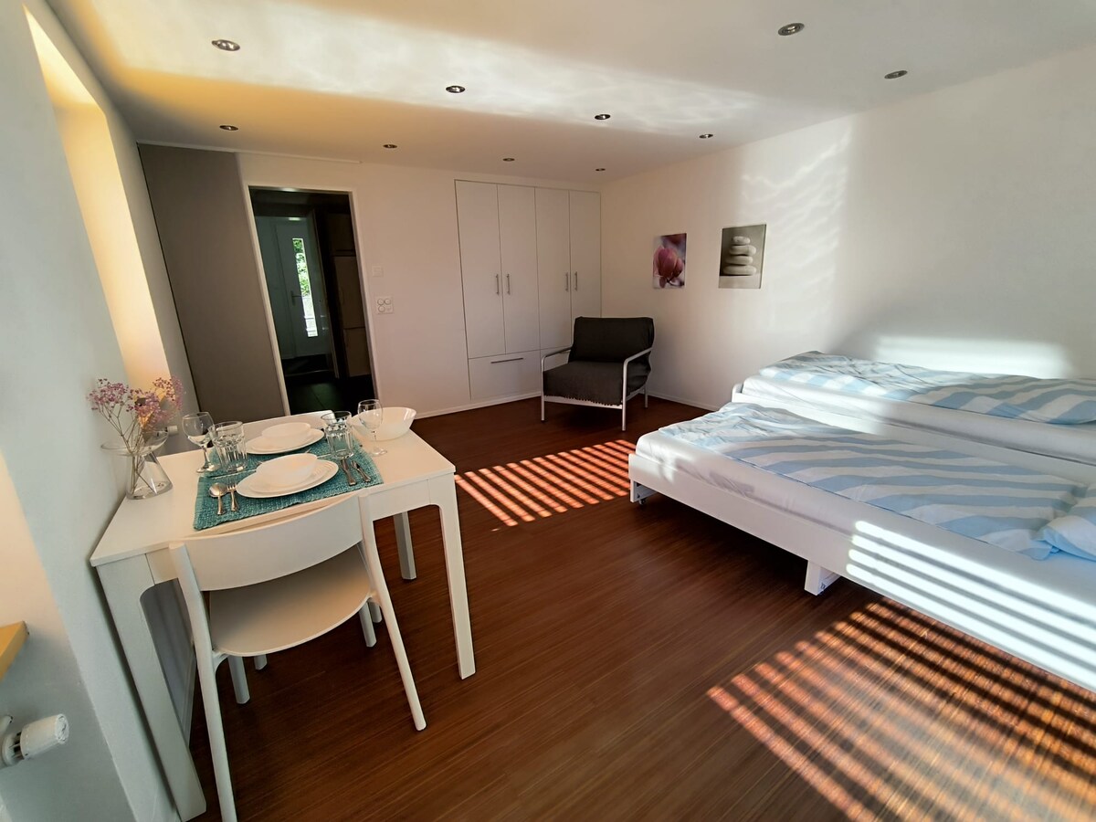 私たちは、一戸建ての家にあるモダンなワンルームを貸し出しています。スタジオは1階にあり、専用の入り口があり、共有階段を除いて私たちのリビングエリアとは完全に分離されています。 私たちは持続可能性を大切にしています。私たちの家は地熱で暖房されており、太陽光発電システムで電気を発電しています。良心に悩まされることなく一日を始められる、特別な気持ちを体験してください。正面玄関のすぐ隣に無料駐車スペースがあります。
