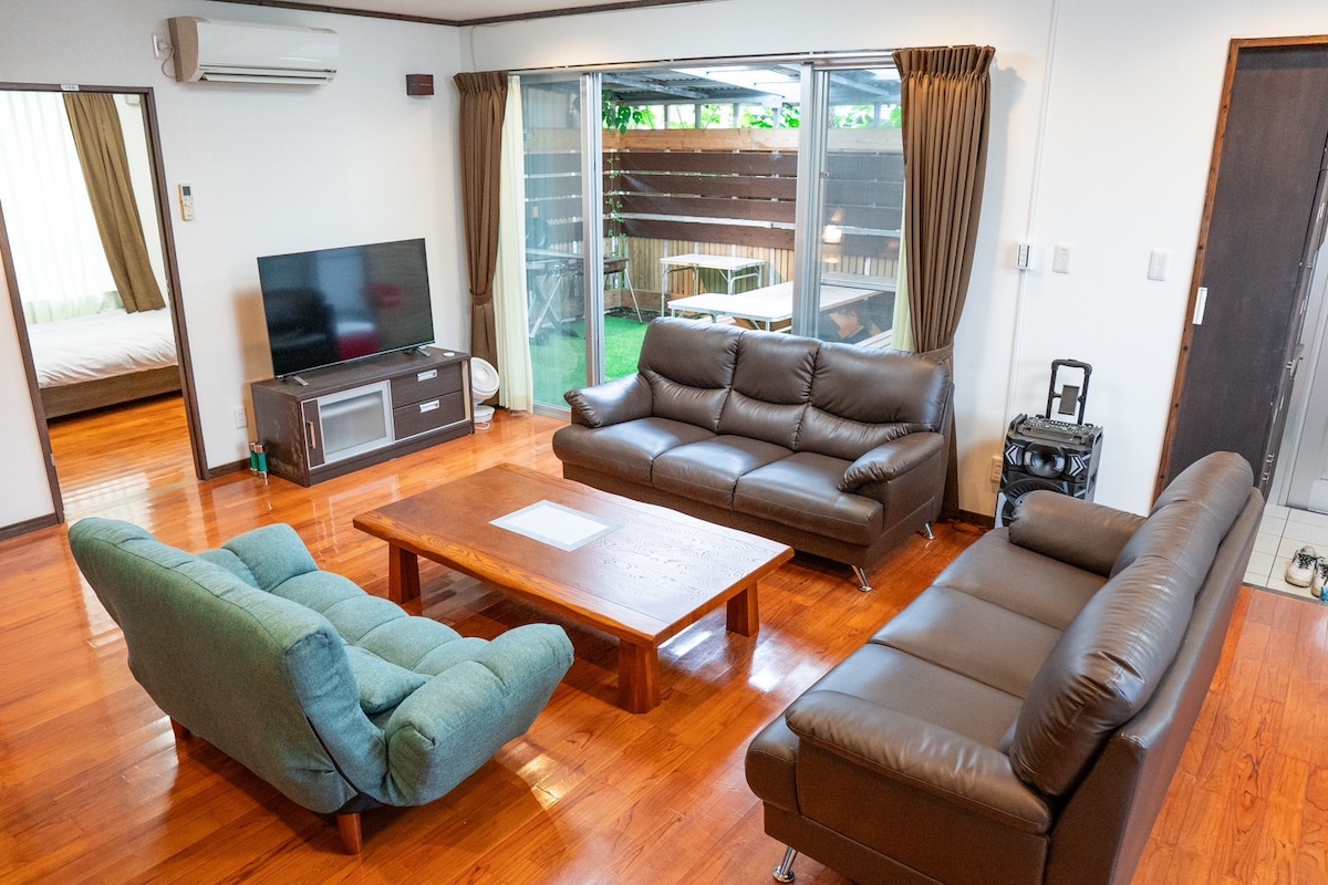 5LDKの貸切別荘式です。 ファミリーやカップルなど2名以上でご利用の方のみ貸切式をご利用いただけます。 ご了承くださいませ。 m(__)m 陽当たり風通り良好。 大きめウッドデッキの縁側と芝生スペースでBBQ可。エアコン有。夜は星と蛍も。渡口beach、スーパー、ご飯屋、居酒屋すべて15分以内です。 生活用品だいたいすべて有ります。鶏小屋の卵、畑の野菜やハーブはご自由に収穫okです。 (鶏の体調や時期により収穫できない時もございます。ご了承くださいませ) そして屋上への階段によりsunset &sunrise &月光浴が可能となりました。 寝具はお布団ですのでごろごろできます♩ 最初に鍵をお渡ししますのであとは自分のお家だと思って自由な沖縄ライフをどうぞ。 是非一度遊びにいらしてくださいませ。 (^_^)